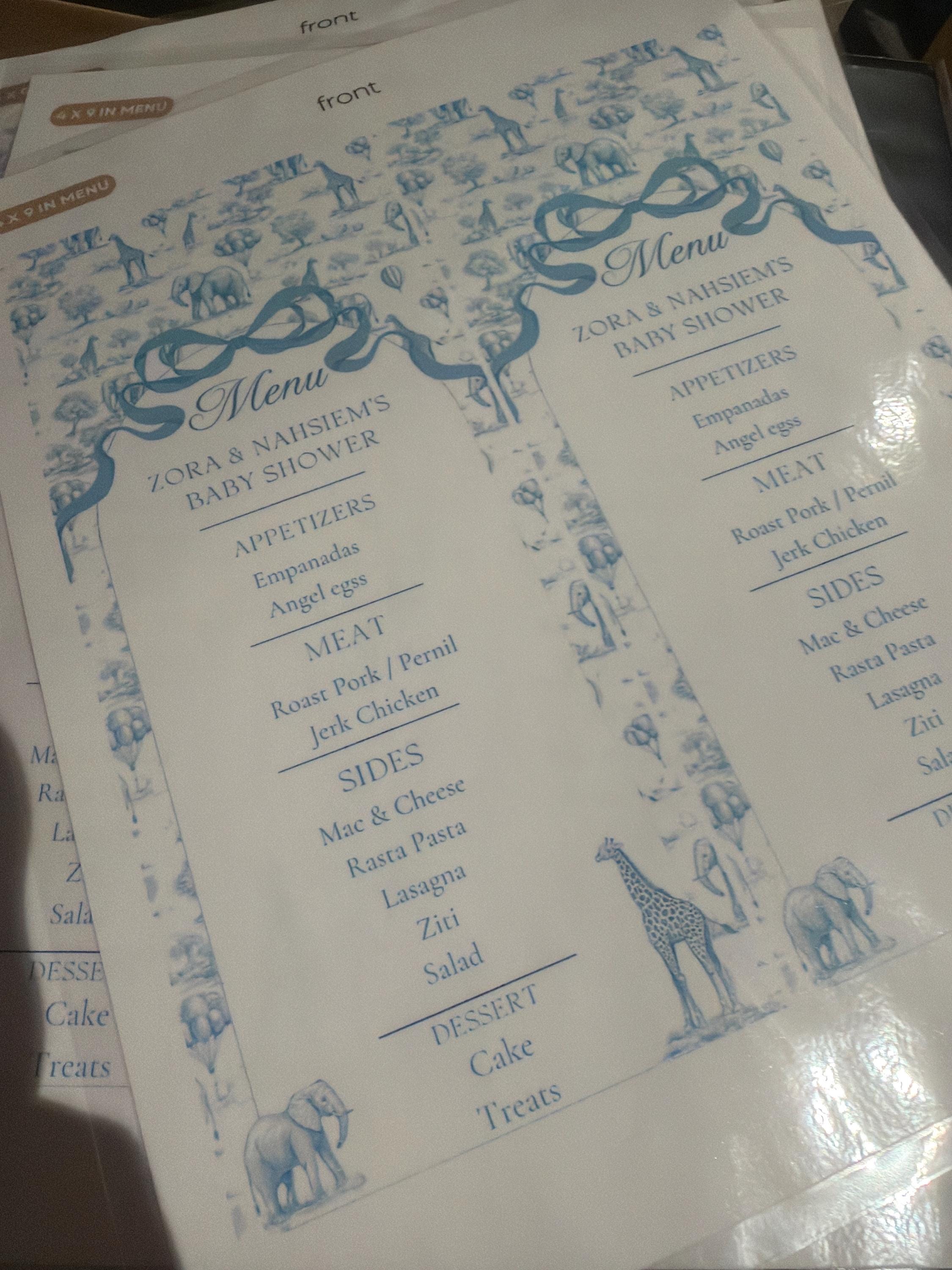 • Canva SELF editable Template of Blue Toile Baby Shower Menu with elegant safari design